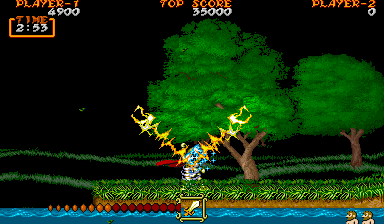 What's not immediately obvious is that when you're doing these magical attacks, you have a (very) brief window where you're all but invincible. It's basically as long as Arthur is holding his arm in the air. It's kind of hard to see here, but there's an enemy passing right through him unharmed.